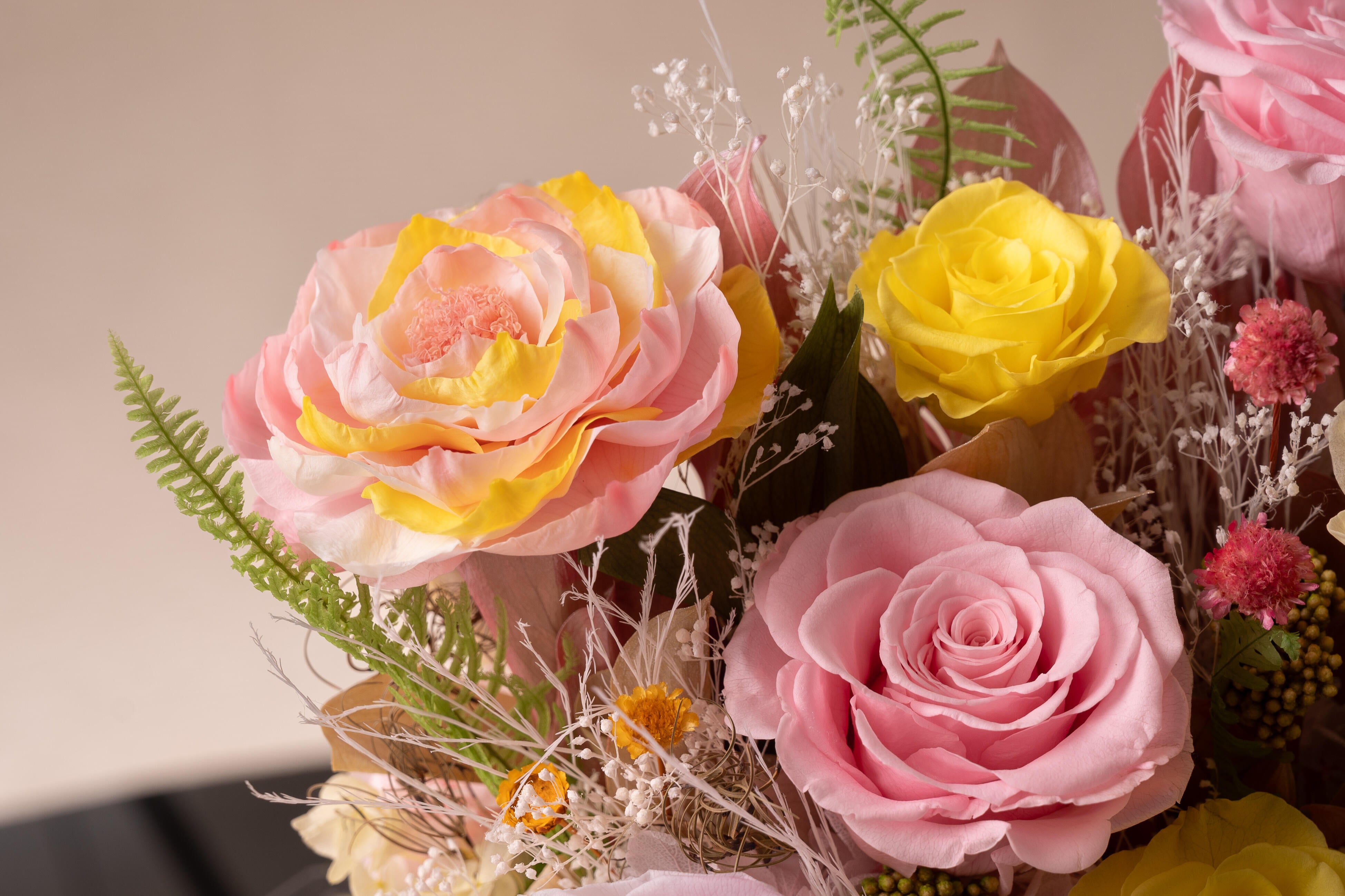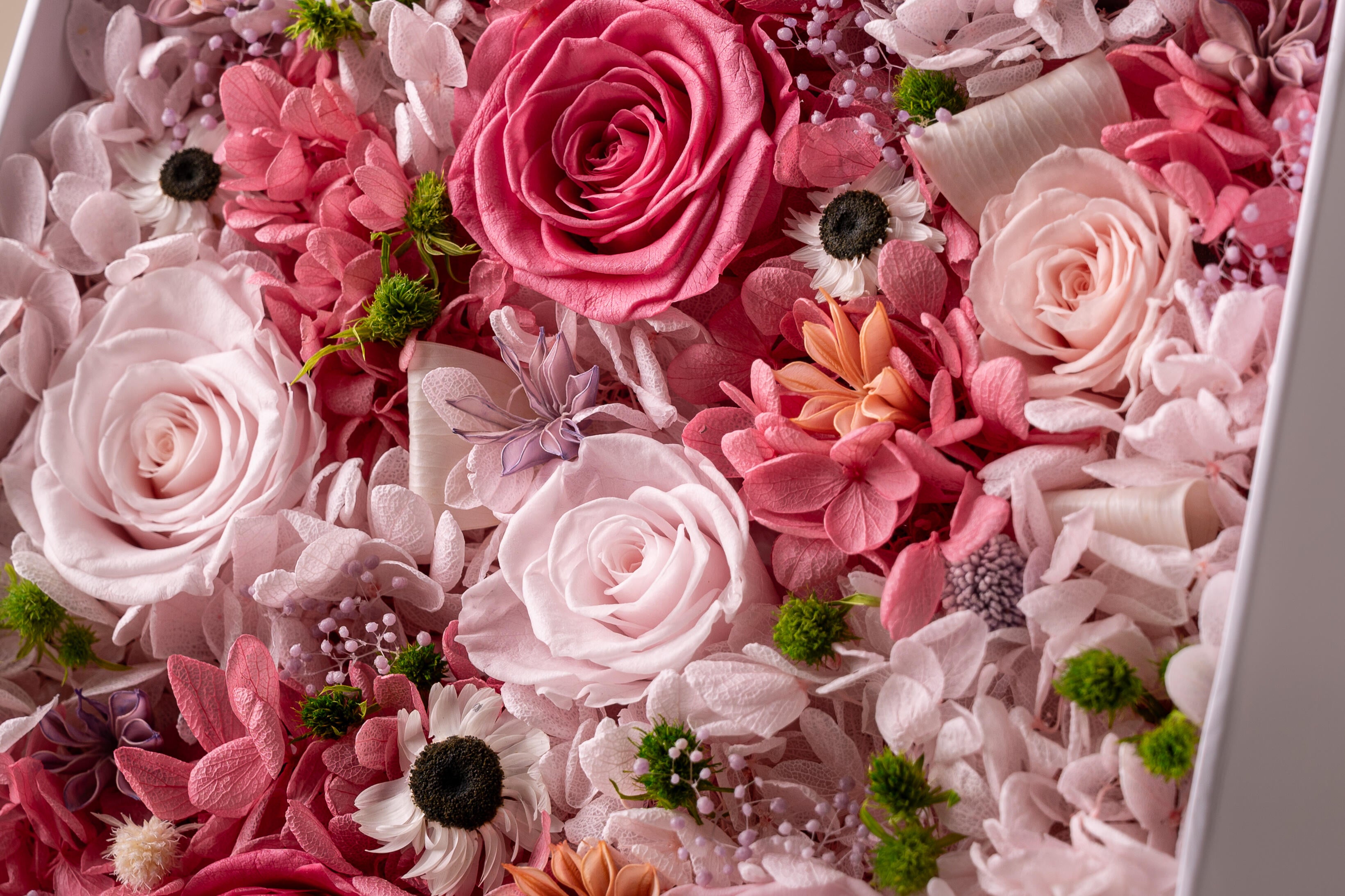 The preservation process involves carefully selecting fresh flowers at their peak beauty and then treating them with a natural, non-toxic solution that replaces the sap and water in the petals. This process stabilizes the flowers, allowing them to retain their softness, vibrant colors, and natural appearance for years to come, without the need for water or sunlight.